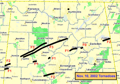 Map of 11/10/02 Tornadoes in Alabama via NWS Birmingham |