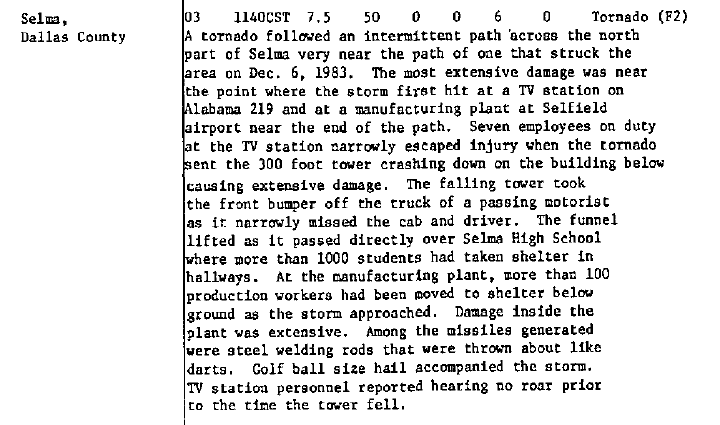 On this date in 1984, 17 tornadoes occurred in Alabama. The most significant tornado occurred in Montgomery, where five people were killed and 37 injured in an F3 tornado which touched down just before rush hour on the Northern Bypass at 7:00 a.m. Four of the fatalities were in automobiles and one in a mobile home. According to the Alabama Tornado database from the NWS Birmingham:"Damage was extensive along the entire path of the tornado. At least 20 homes were destroyed, 36 homes sustained major damage, 157 homes had minor damage, 9 mobile homes were destroyed, 8 businesses were destroyed, and numerous vehicles were destroyed."