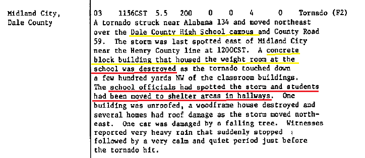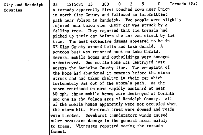 No fatalities were reported in any of the other 16 tornadoes which occurred across Alabama that day.