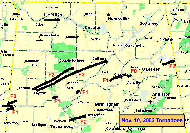 | Map of 11/10/02 Tornadoes in Alabama via NWS Birmingham |